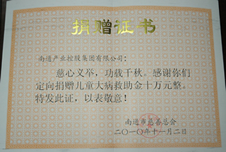 在本月初召開的“2010年慈善南通主題專場文藝晚會”上,產(chǎn)控集團(tuán)及其控股的上市公司南通科技和江山股份聯(lián)袂上臺接收市慈善總會發(fā)給的捐贈證書,被與會者視為佳話。 據(jù)悉,為幫助我市患大?。ò籽 ⑾忍煨孕呐K病、尿毒癥、惡性腫瘤)兒童,產(chǎn)控集團(tuán)定向捐贈兒童大病救助基金10萬元,南通科技和江山股份各捐贈20萬元,合計50萬元。